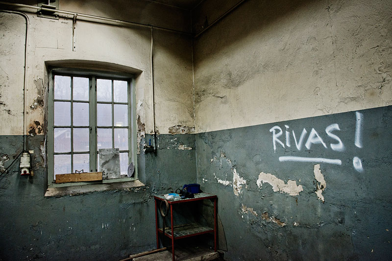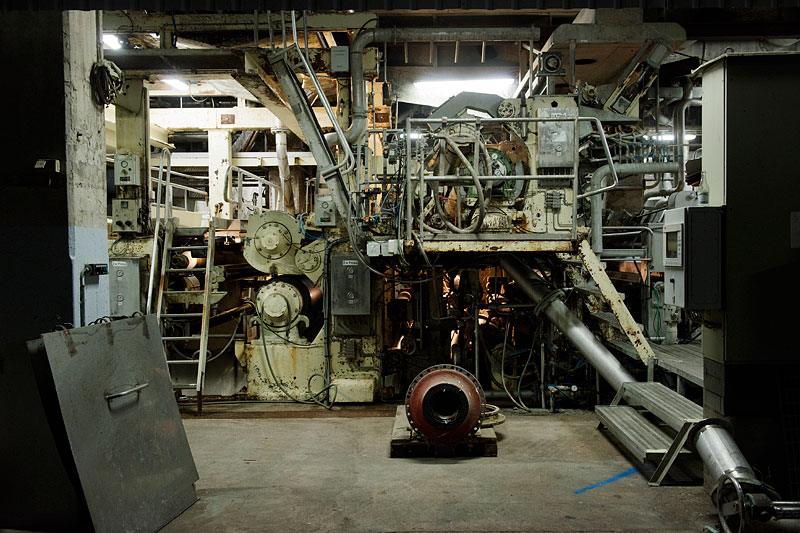 Vi lämnar källaren och går upp i maskinhallen. Lars känner bruket väl, men har lite svårt att hitta lampknapparna. När skiften avlöste varandra var det ingen mening att släcka i taket. Nästan alla brukets maskiner har sålts och forslats bort, men pappersmaskinen står fortfarande kvar.