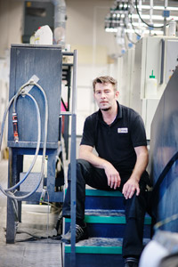 Vid offsetpressen sitter Stefan Sandin (bilden till höger), redo för att lunchlugnet ska brytas av nya order att trycka. Han gick också med i facket när han började jobba, men gick ur för många år sedan. För honom fanns inte facket där när det behövdes. Företaget han jobbade på avvecklades och han sökte kontakt för att få hjälp och svar på frågor, men ingen brydde sig om att svara.