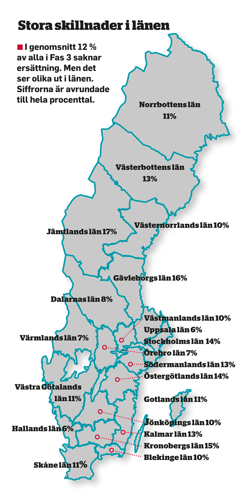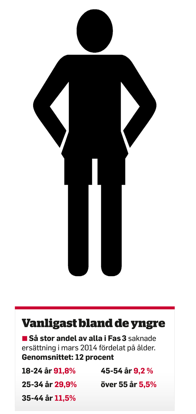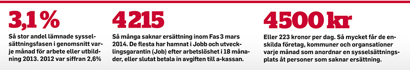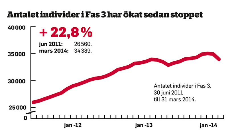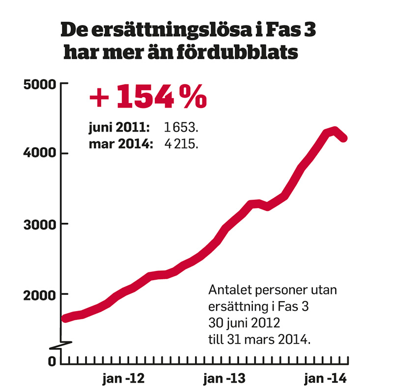 När riksdagen satte sitt Fas 3-stopp var antalet ersättningslösa 1 653 – eller 6 procent av alla inskrivna. Drygt två år senare, mars 2014, har siffran ökat till 4 215 personer, eller 12 procent.