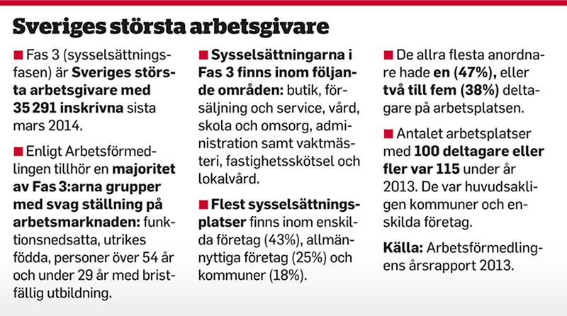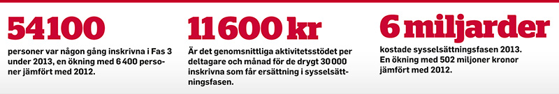 Av de 54 100 personer som passerade genom Fas 3 förra året deltog bara 1 602 personer i någon annan insats hos Arbetsförmedlingen. Av de 1602 personerna deltog hälften i en arbetsmarknadsutbildning och en tredjedel i arbetspraktik. Resten deltog i olika förberedande utbildningar, arbetslivsinriktad rehabilitering och stöd till start av näringsverksamhet.