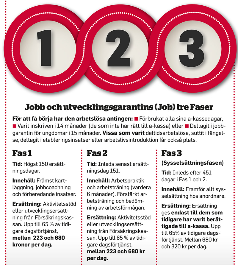 I Fas 1 och 2 har alla deltagare fått aktivitetsstöd från Försäkringskassan, men i Fas 3 tar det stopp för dem som inte har varit berättigade till a-kassa. I stället för aktivitetsersättning på 223 kronor om dagen som de tidigare har haft får de vända sig till sin hemkommun och be om försörjningsstöd. Något som inte alla beviljas.