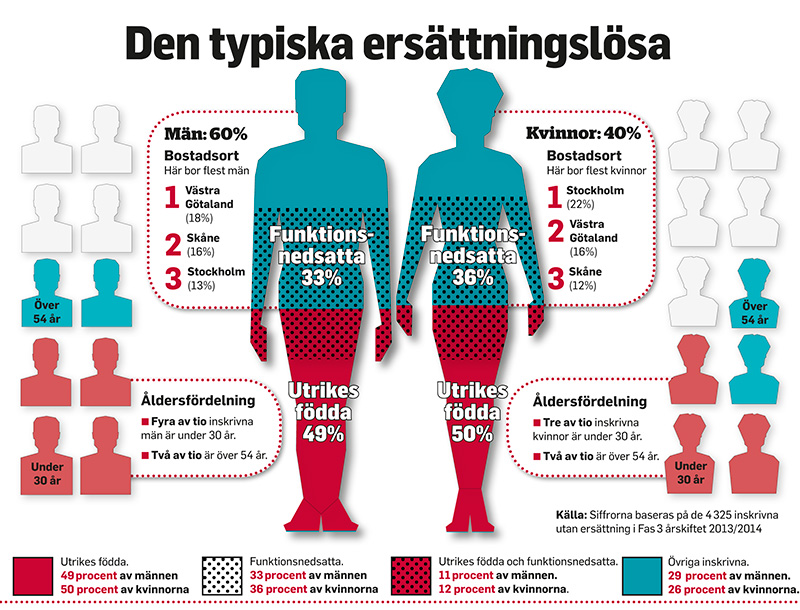 Hälften av de ersättningslösa var utrikes födda jämfört med var tredje bland Fas 3:arna som helhet och andelen män är 60 procent bland de ersättningslösa mot 53 procent i Fas 3.