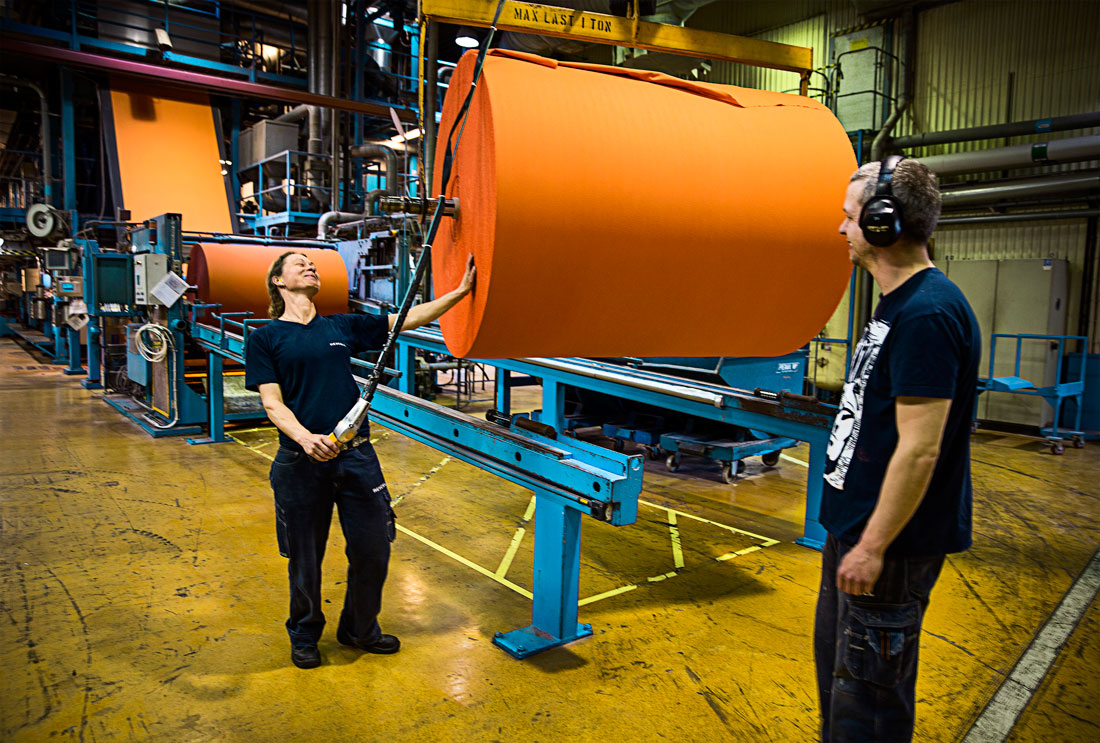 Utanför kontrollrummet stampar torrmassamaskinen TM2:an fram ton efter ton med airlaid-rullar som ska bli till pappersdukar och servetter.