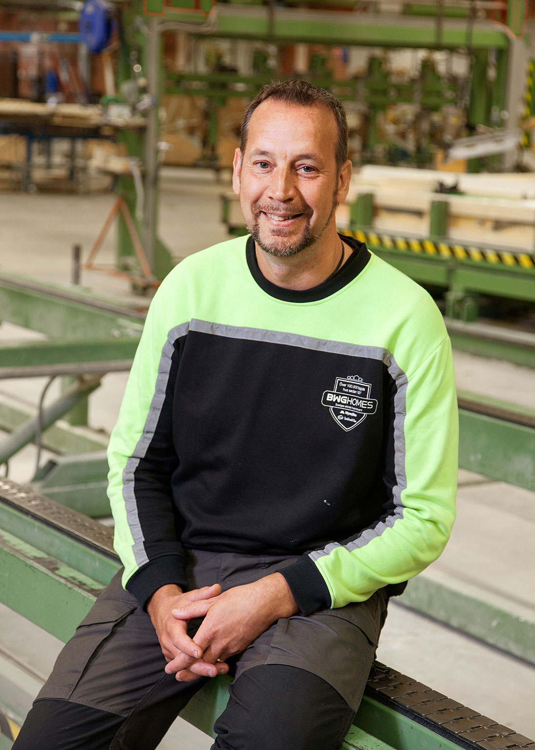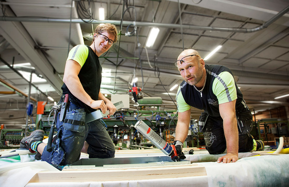 Ute i fabriken bygger Christian Lundbom ett väggblock tillsammans med kollegan Johan Westring. Christian hade varit anställd på ett bemanningsbolag i 1,5 år när han bad om att få byta till ett uppdrag på Myresjöhus för att få användning för sin utbildning som snickare. Det var innan bemanningsavtalet var klart, men han fick ändå anställning på Myresjöhus rätt snabbt.