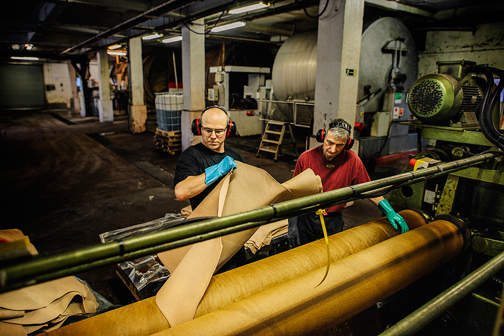 Det är Peter Fribergs, i mitten, första dag på jobbet och Kjell Forsberg, som har jobbat på Tärnsjö Garveri nordväst om Uppsala sedan 1974, visar honom hur skinnen ska valsas.