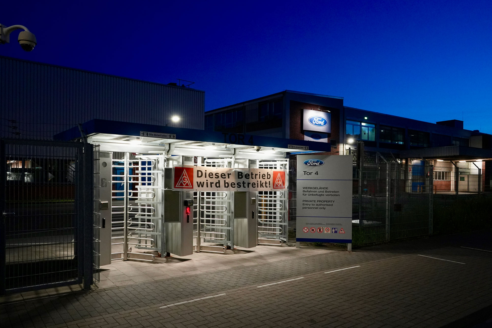 En strejkbrytare hade inte haft det enkelt att obemärkt ta sig in i Fords fabrik i Köln under strejken i förra veckan. Grindarna hade tejpats igen och fabriken vaktades av fackmedlemmar med bengaler i händerna.