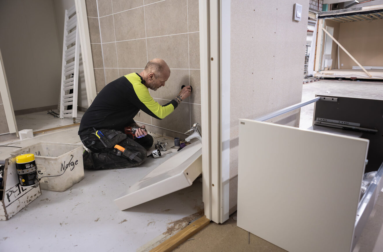 VVS-teknikern Peter Lindbäck sorterar i rask takt ut de skruvar och rördelar som tillhör toaletten, handfatet och handdukstorken som ligger utspridda i rummet. Arbetskamraten blev nyss klar med listerna i badrummet i trähusmodulen och nu är det dags för Peter Lindbäck att installera allt i det.